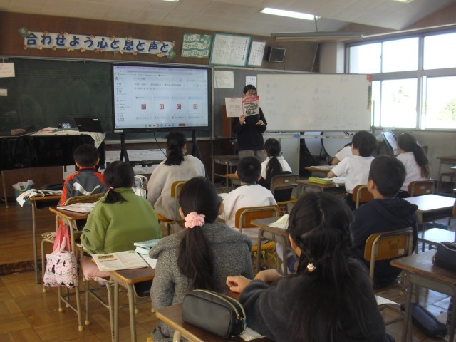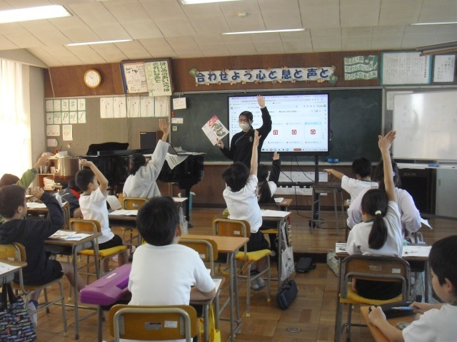 音楽の授業です。楽器の音色について学習をしています。トロンボーン、ホルン、トランペット、チューバの音の違いについて確認しています。