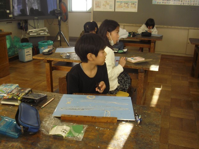 図工の授業です。版画の作成をしています。手を切らずに上手に彫っています。