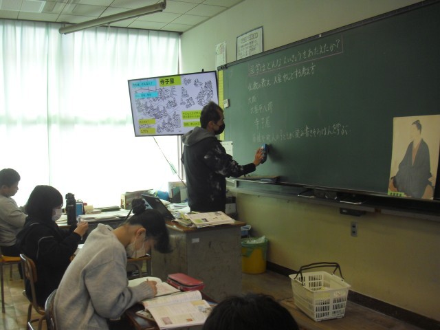 社会科の授業です。国学がこの頃の文化に与えた影響について調べています。来週テストがあるようです。頑張ってほしいです。