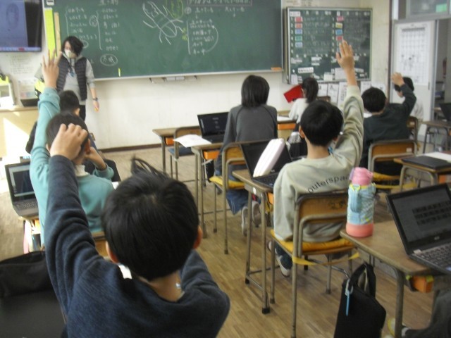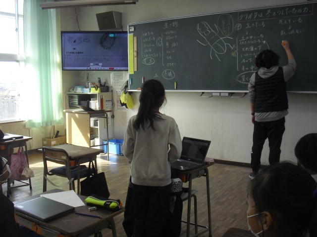 理科の授業です。クワガタは冬どうしているのかという学習課題について、話し合っています。冬眠しているのではないかという意見や死んでしまうのではないかという考えが出されました。自分の考えを理由を付けて発表している姿がまるで高学年のようでした。さすが4年生です。
