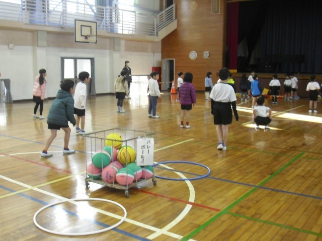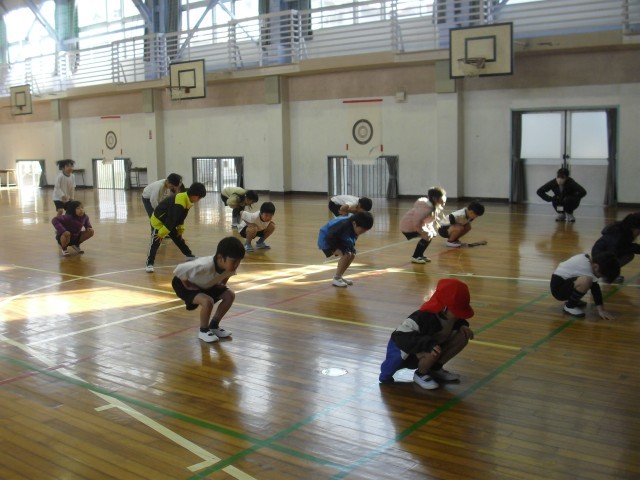 体育の授業です。準備運動をしています。体育係を中心にしっかり体を温めています。
