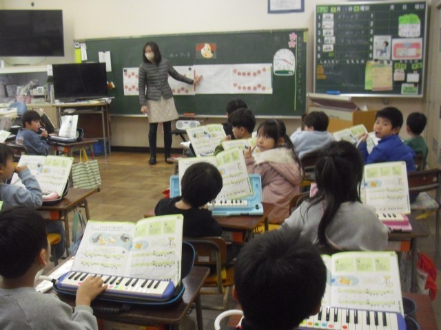 音楽の授業です。子犬のマーチを先生のオルガンに合わせて鍵盤ハーモニカで演奏しています。