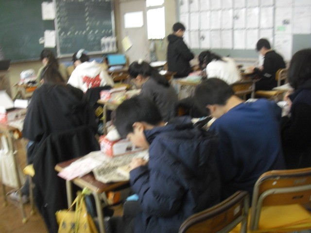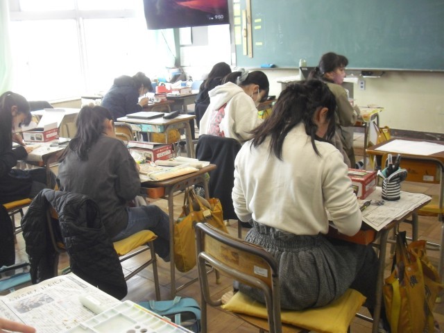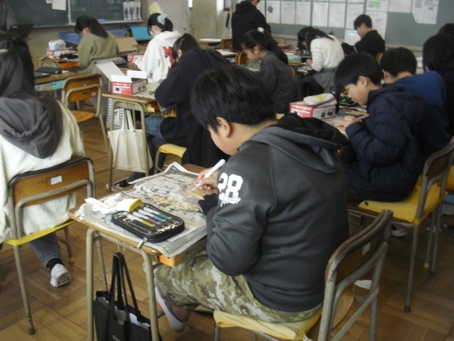 図工の授業です。卒業の記念品をつくっています。彫刻刀で丁寧に削っています。手が紅に染まらないように気をつけてください。