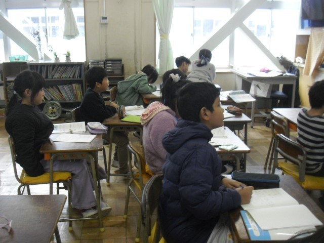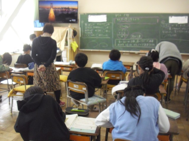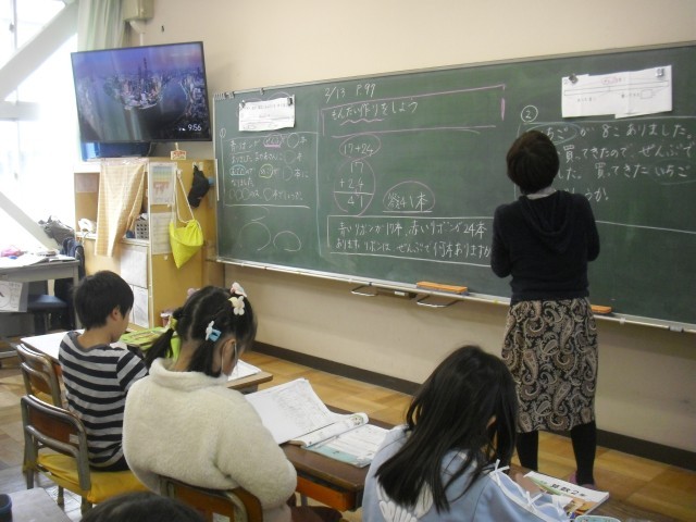 算数の授業です。テープ図から問題作りを行っています。たし算とひき算を区別するキーワードを忘れないように文章に入れています。