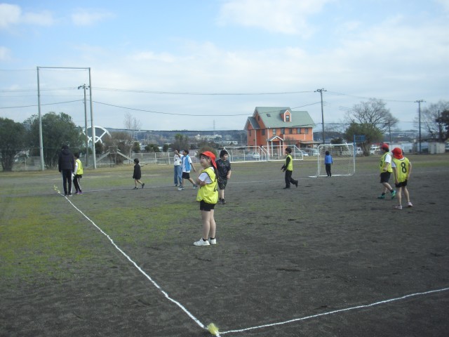 体育の授業です。サッカーの試合を行っています。みんな楽しそうに取り組んでいます。終わった後はみんなでゴールやボールの片付けを行っています。さすがですね。