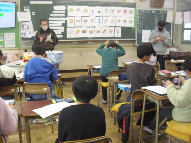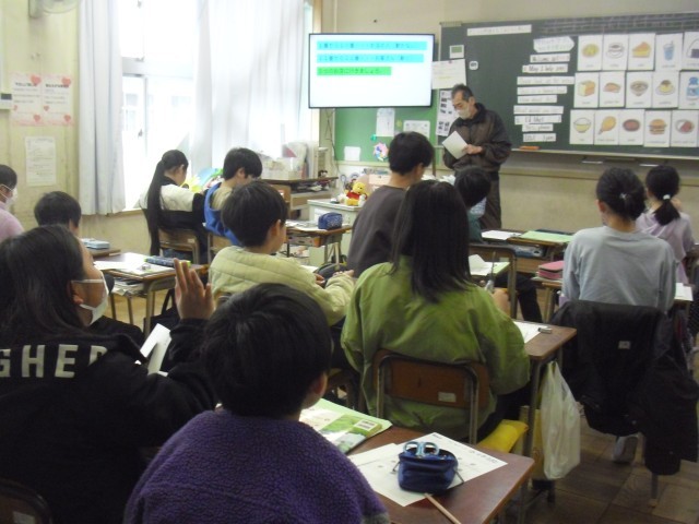 言語英語の授業です。食べ物の英単語を復習しています。ALTの発音を聞きながら発声しています。