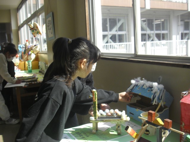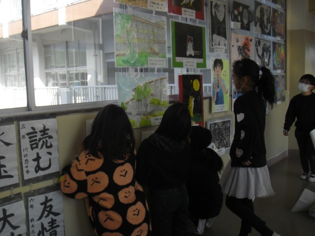 図工の授業です。他の学年の作品を見て鑑賞を行っています。作品の素晴らしさを見つけています。