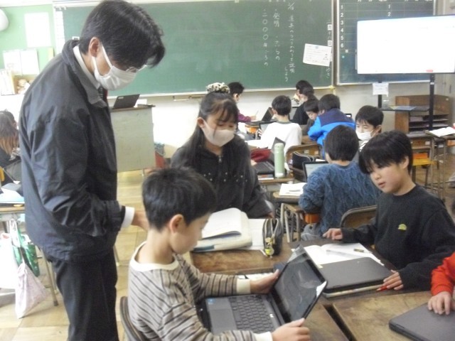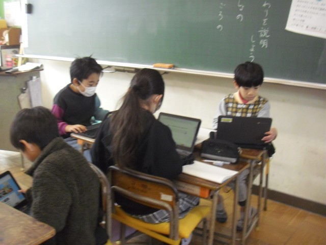 国語の授業です。両クラスとも昔の道具について調べています。家電用品がどれだけ進化したか、時代を遡って調べています。