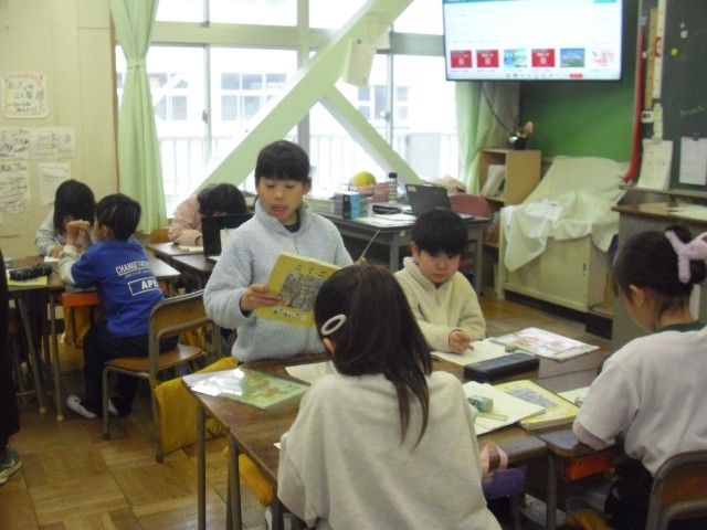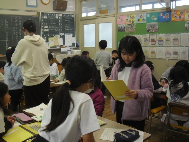 国語の授業です。自分の宝物を紹介し合っています。しっかり話を聞いてメモをとっています。