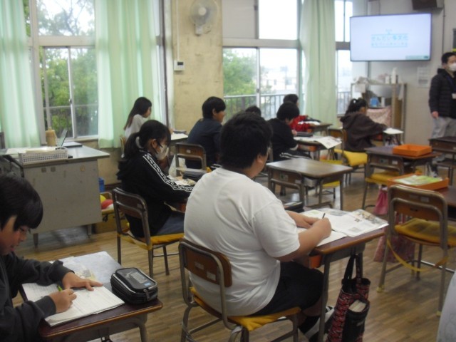 社会科の授業です。仙台市の取り組みについて調べています。みんな真剣に授業に取り組んでいます。