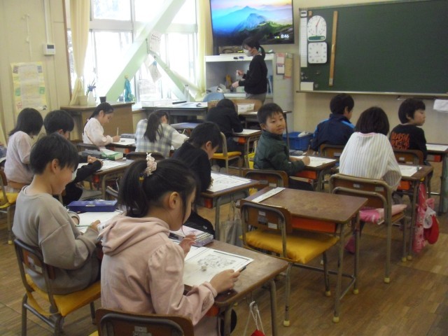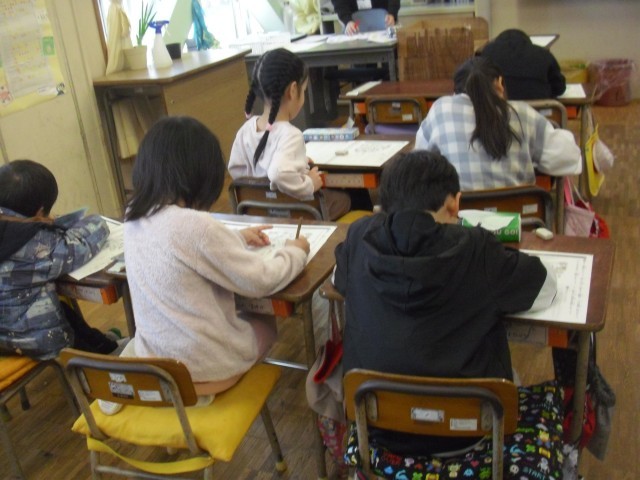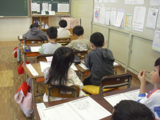 国語の授業です。イラストを見て問題に答えています。よくイラストを見て考えています。そのように考えて理由もしっかりかけています。