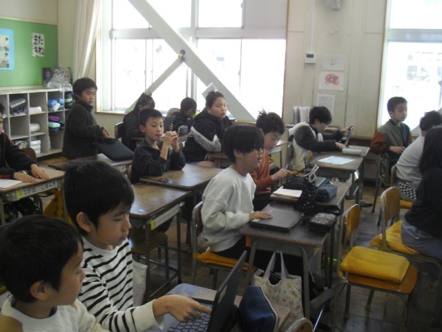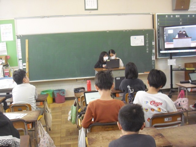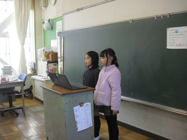 社会科の授業です。昔のどうについて調べてことを発表しています。クロームブックを使って上手に発表しています。