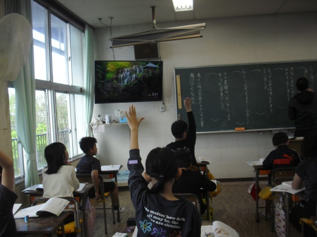 国語の授業です。全体の流れを確認しています。それぞれの場面で主人公の心の揺れに着目しています。