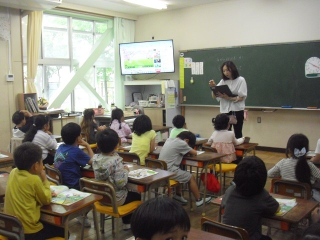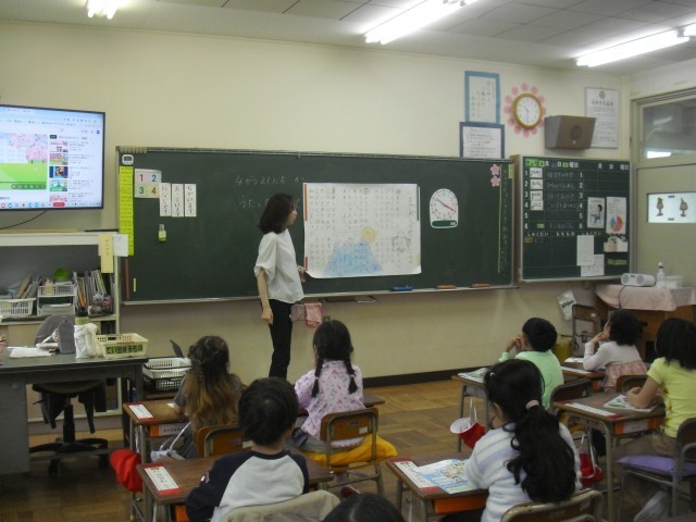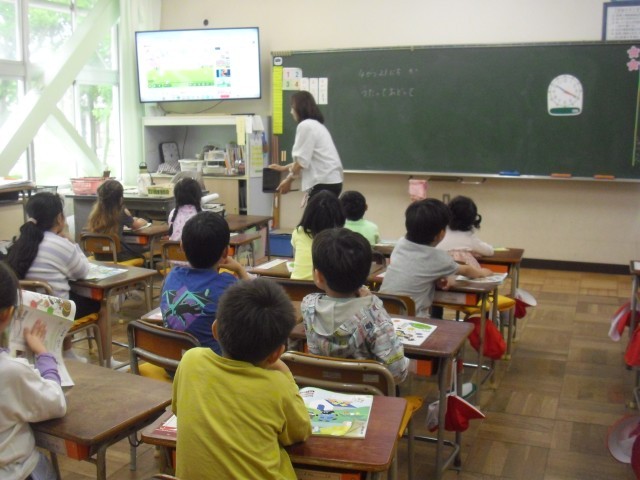 音楽の授業です。校歌の練習をしています。早く覚えられるといいですね。
