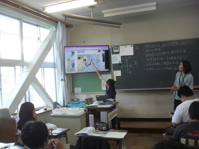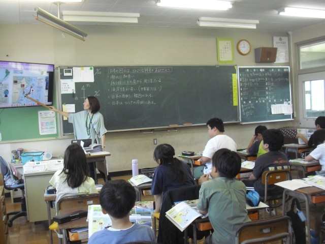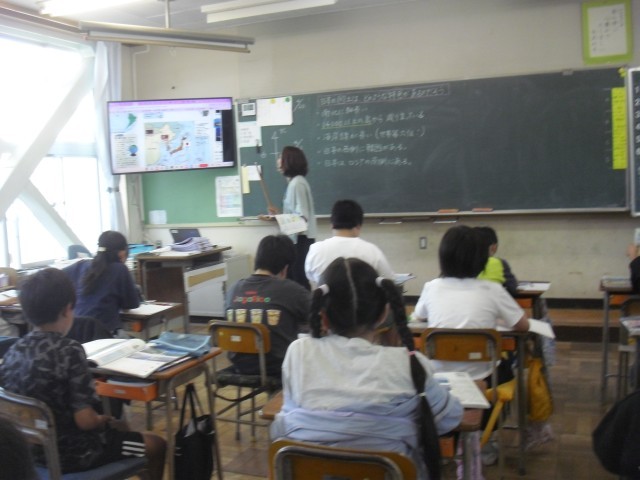 社会科の授業です。このクラスも大型提示装置を使って近隣諸国の位置を確認しています。