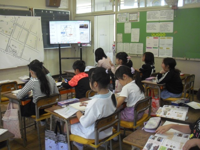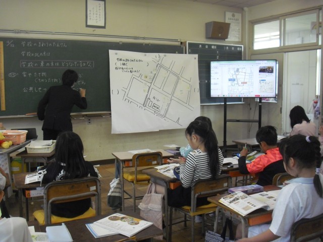 社会科の授業です。公共施設について学んでいます。学校近くにどんな施設があるかこの後調べに行くようです。