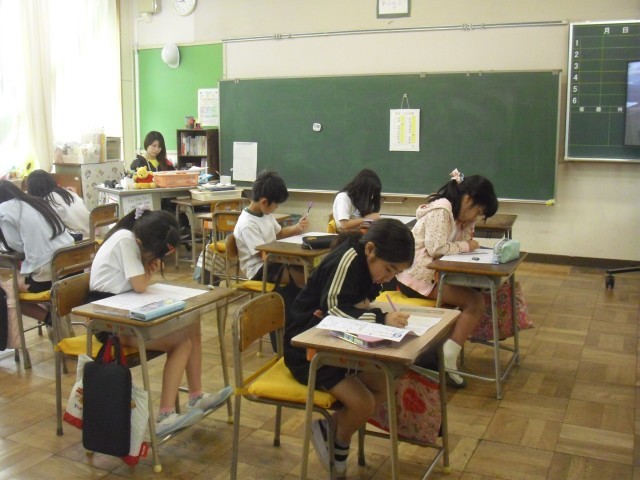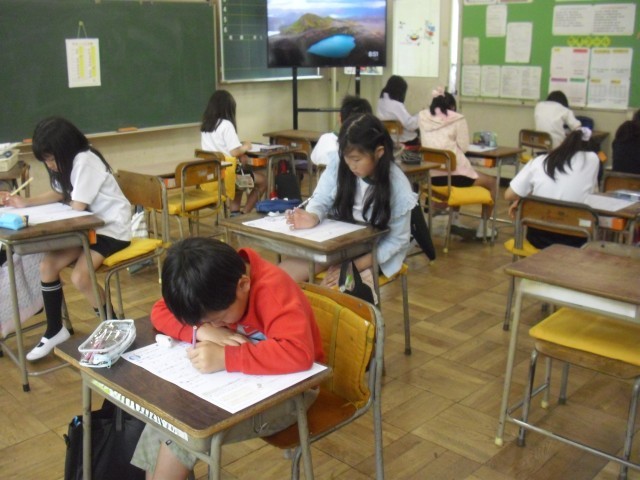 国語の授業です。テストを行っています。みんな真剣に取り組んでいます。