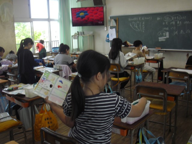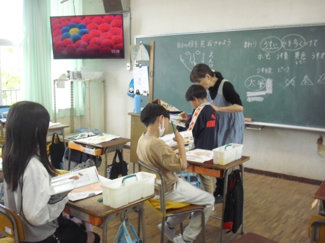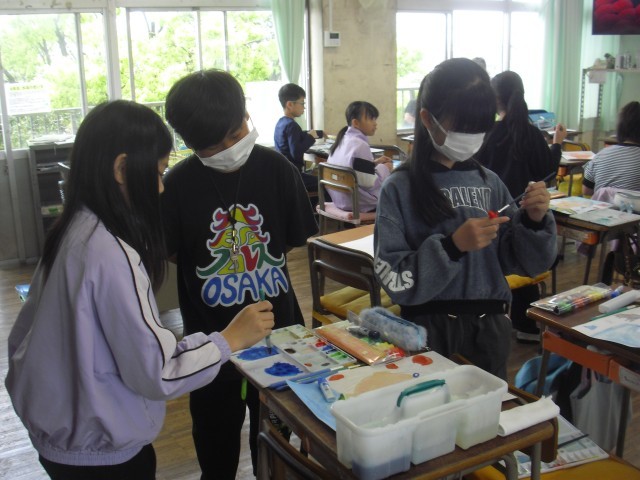 図工の授業です。自画像を作成しています。色塗りに入りました。