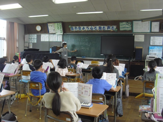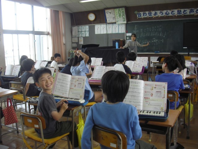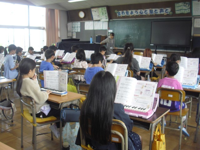 音楽の授業です。鍵盤ハーモニカの練習をしています。指の動かし方に気をつけながら練習しています。