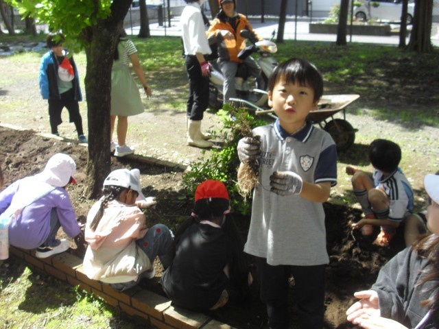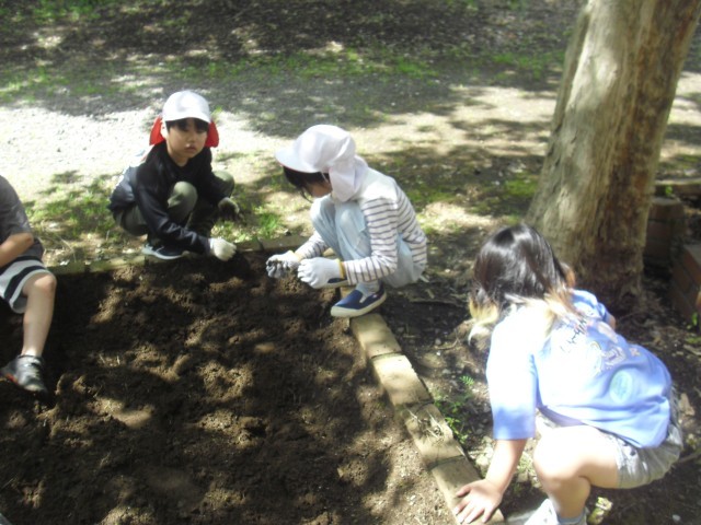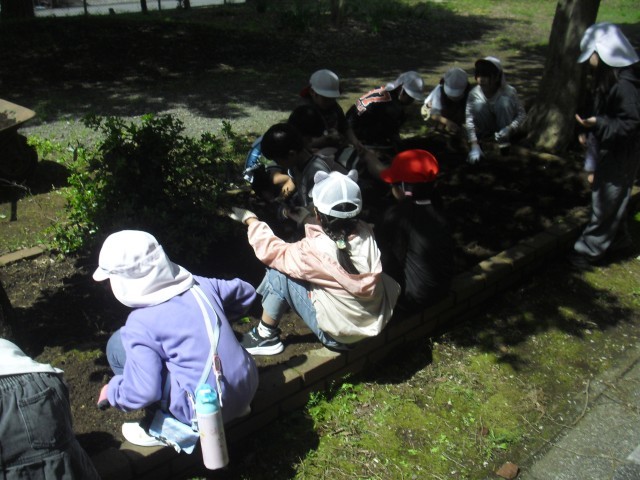 理科の授業です。花壇の手入れをしています。雑草や根っこをとっています。何を植えるのか楽しみです。