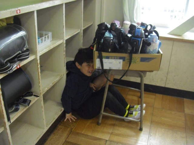 音楽の授業です。かくれんぼの歌に併せて本当にかくれんぼをしています。先生に見つからないようにみんな上手に隠れています。