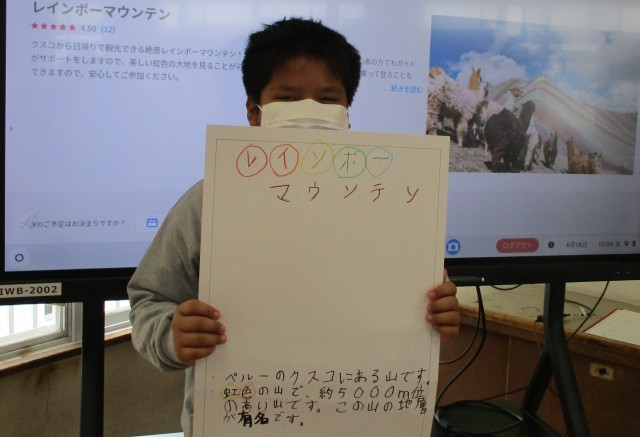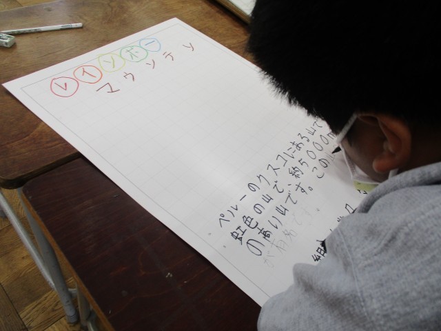 クラスのみんなに伝えたい母国の美しさをUmi NEWSとしてポスターにしてまとめています。ひらがなだけでなく,漢字も使って表現したいという思いをもちました。あっという間に習得していました。誰もが読めるように,るびをふっていました。やりきる体験をもち,自信と誇りをもちました。