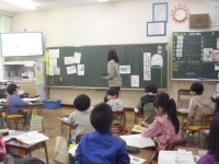 図画工作の授業「ぶどうを ぬろう」。絵の具でぶどうに色をつけていきます。初めてのチャレンジで、最初は緊張していましたが、上手にぬることができたようです。