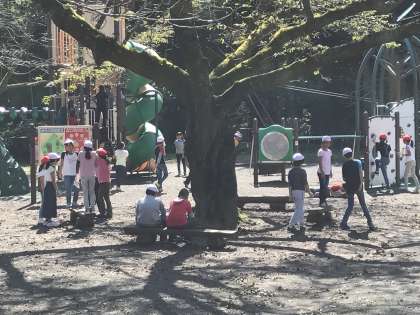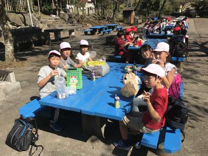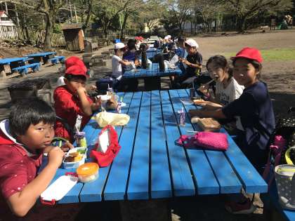 自然教室のウオークラリーが終わり、集いの広場でグループごとお昼ごはんを食べました。