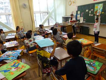 1年1組は図工、「やぶいたかたちから」の授業です。