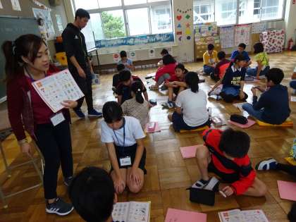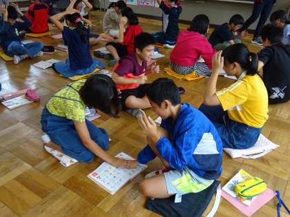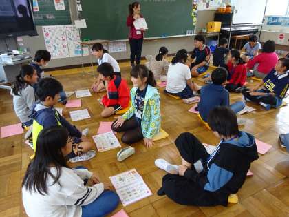 6年1組は言語英語の授業です。「I like sushi.」どちらがはやいでしょうか。