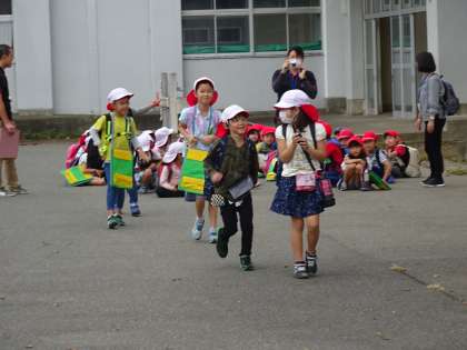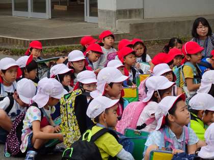 2年生が生活科の校外学習で楽寿園に出かけます。学校から片浜駅までグループで歩いて行きます。安全に気をつけてくださいね。いってらっしゃい。