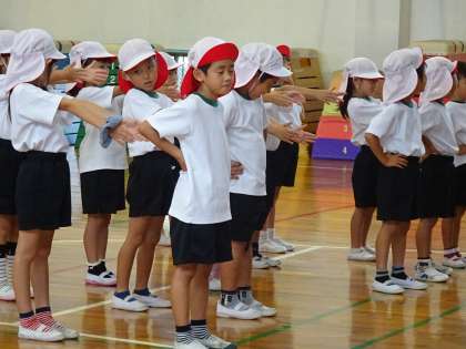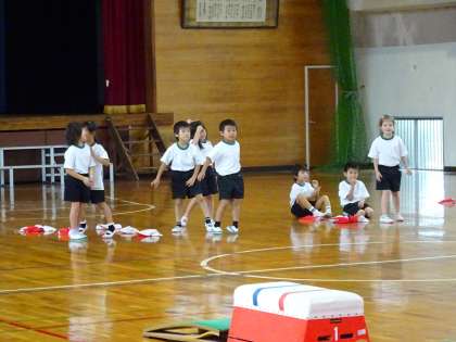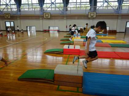 1年2組は体育の授業です。体育館でとびばこを使った運動をしています。