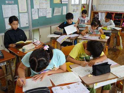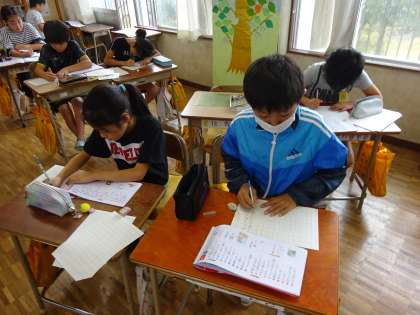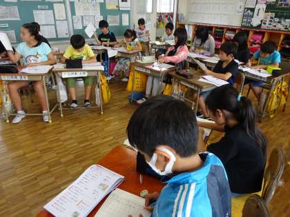 4年1組は国語の授業です。漢字のプリントに取り組んでいます。