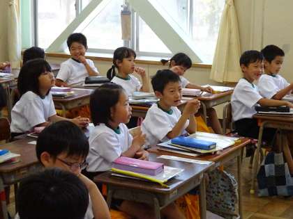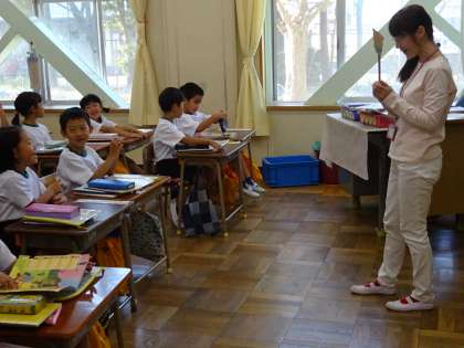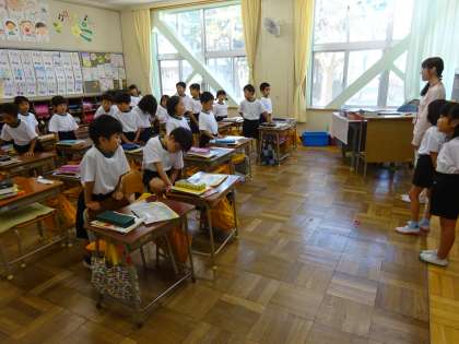 1年1組は国語の授業です。元気のよいあいさつから楽しい授業が始まります。