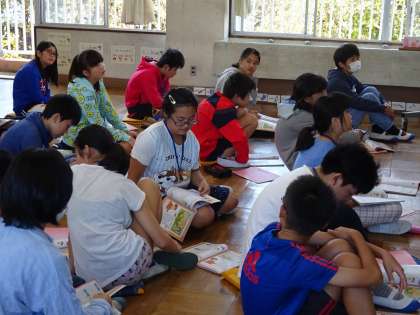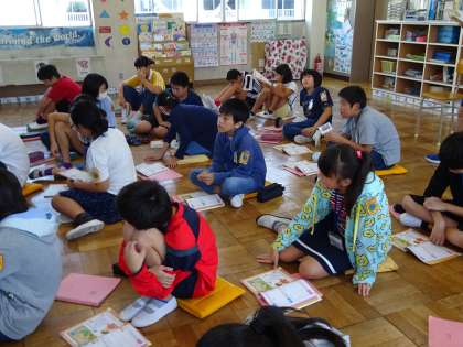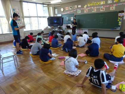 6年1組は言語英語の授業です。「Who am I? I like dorayaki.」