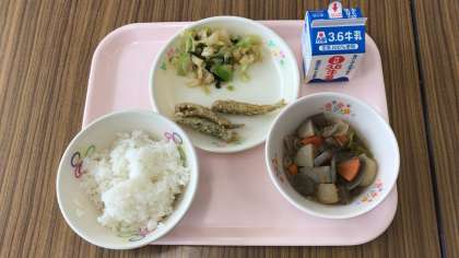 今日は「和食の日」です。 ごはんと牛乳、そして、芋煮といわし揚げ、おひたしです。