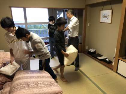 二日目が始まりました。起床後は、荷物まとめと室内の整頓をしました。そして朝食です。