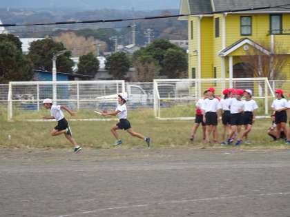 5年1組は体育の授業です。グランドでリレーの練習をしています。スピード感がありますね。