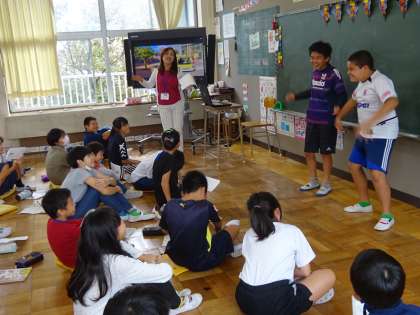 5年2組は言語英語の授業です。ALTのマイラ先生、担任の刑部先生と楽しそうに活動しています。