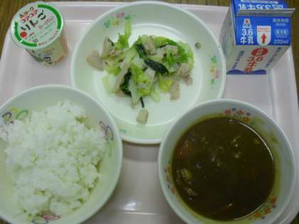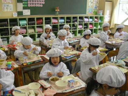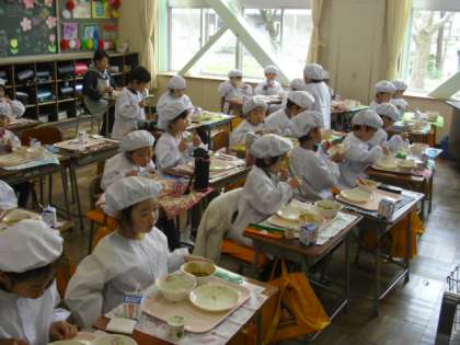 1年生は、本日が初めての給食です。皆さんおいしそうに、楽しくいただいています。