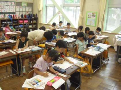 1年生は書写の時間です。ひらがなを、良い姿勢で、ていねいに書きます。