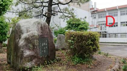 D:にしもんからはいったつきあたりのロータリー。とてもりっぱな石碑(せきひ)がありますね。石碑には「ともに鍛えん 身と心(ともにきたえん みとこころ)」とほられています。昭和56年度のそつぎょうせいのみなさんがつくってくださいました。