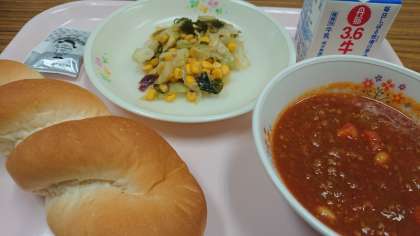 チリコンカンは、メキシコの代表的な料理で、ひきにくや豆をチリパウダーやトマトなどと一緒に煮込んだ料理です。チリは唐辛子、コンは○○と一緒に、カンは肉の意味があります。今日は、豚肉、いんげん豆、たまねぎ、にんじんなどを、ケチャップ、ソース、3種類のスパイスなどで煮込みました。