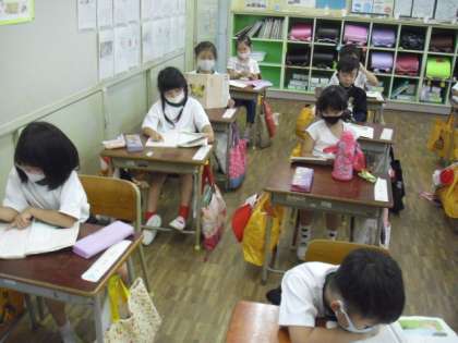 1年生の国語の時間のようすです。「さるじぞう」の音読をしています。