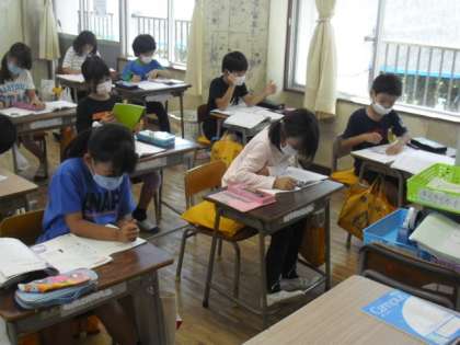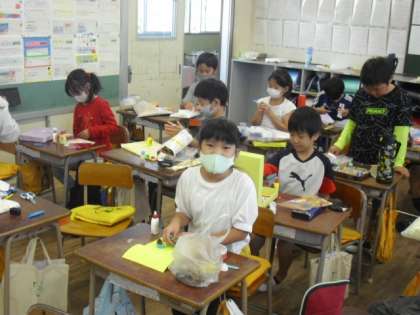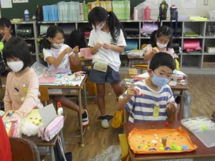1組は算数です。水のかさの学習です。2組は図工です。自分たちで用意したものを使った造形に取り組んでいます。