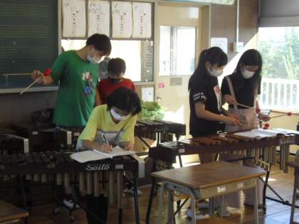 1組は音楽です。「風を切って」の合奏の練習です。2組は体育です。運動場でバトンパスの練習です。