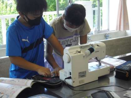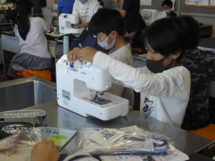1組は算数です。分母の数の違う分数同士の足し算の学習です。2組は家庭科です。ミシン縫いの実習です。