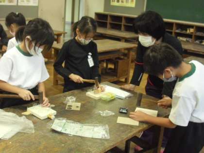 1組は図工です。「くぎうちとんとん」で、釘打ちに挑戦です。2組は音楽です。音符で示されたリズムを確認しています。