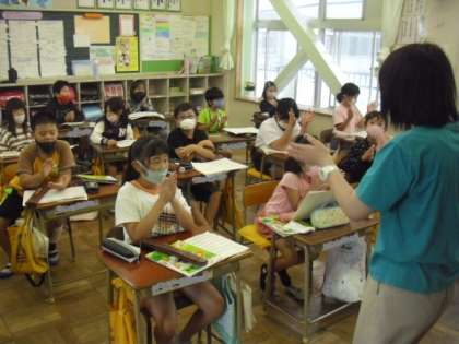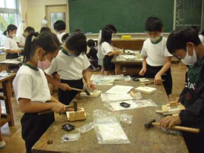 1組は図工です。「くぎうちとんとん」で、釘打ちに挑戦です。2組は音楽です。音符で示されたリズムを確認しています。