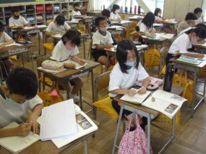1組は国語で「ほしたらどうなる」の学習です。2組は理科です。太陽と地面のようすの関係はどうなるでしょうか?